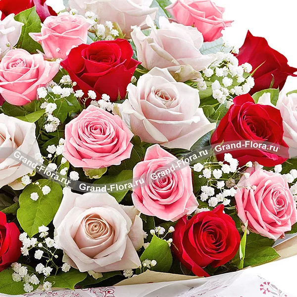 Изящное сочетание элегантных белых, розовых и красных роз деликатно дополнено гипсофилом и салалом.