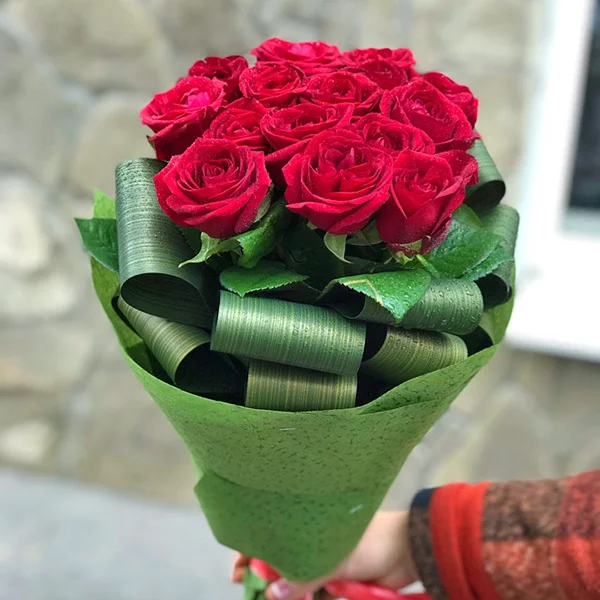 15 роз: роза красная - 15 шт. (Эквадор), лист аспидистры - 4 шт., упаковка, лента.